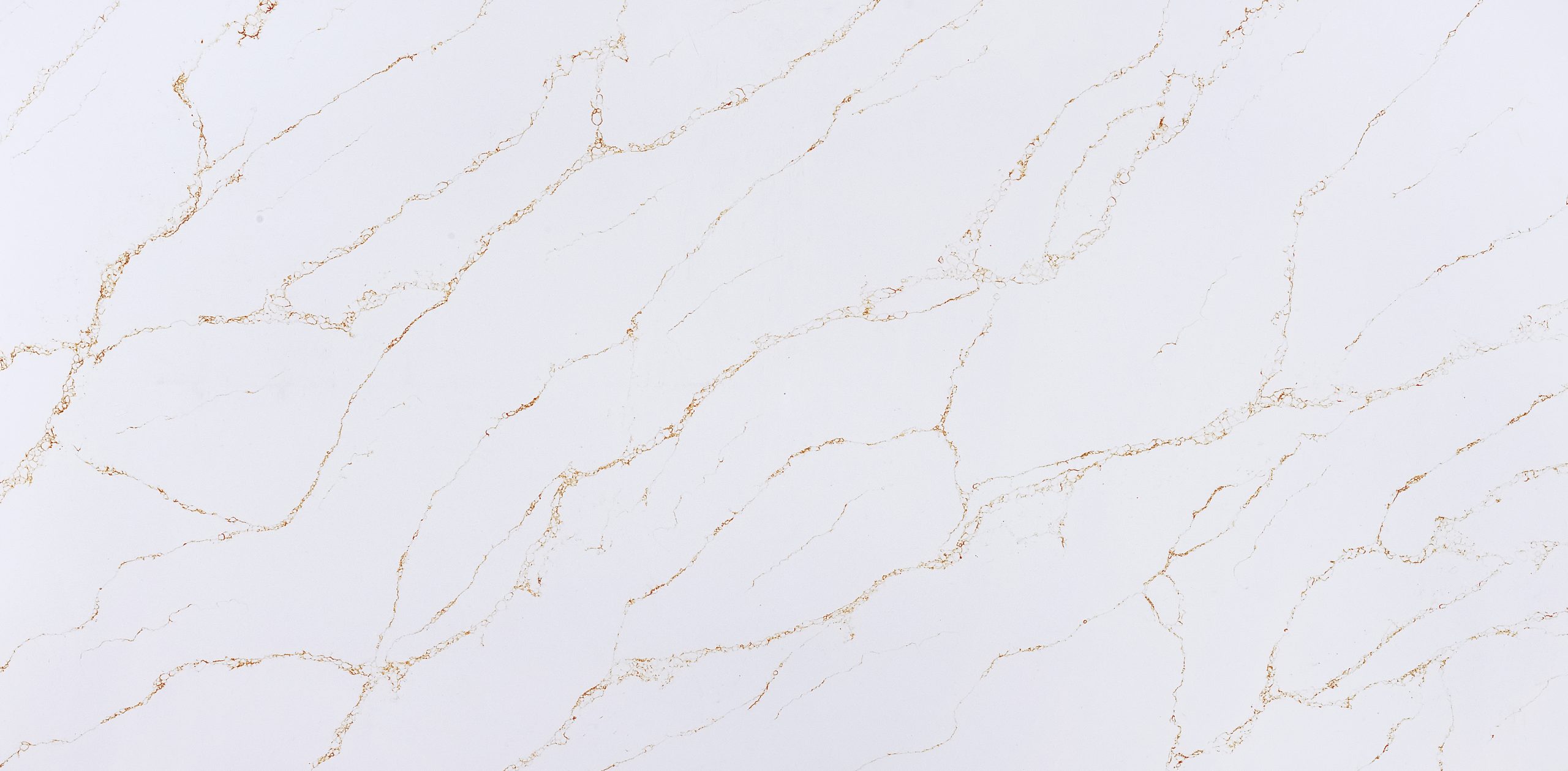 Bianco Gild is an engineered quartz surface, typically composed of 90–94% crushed natural quartz crystal, bound with polymer resin and mineral pigments. With a Mohs hardness rating of 7, quartz is exceptionally hard and durable for kitchen use. The precise ratio of quartz aggregate, resin and pigment controls both the visual appearance and the surface performance. All engineered quartz slabs are manufactured to strict tolerances and tested for durability and finish quality.