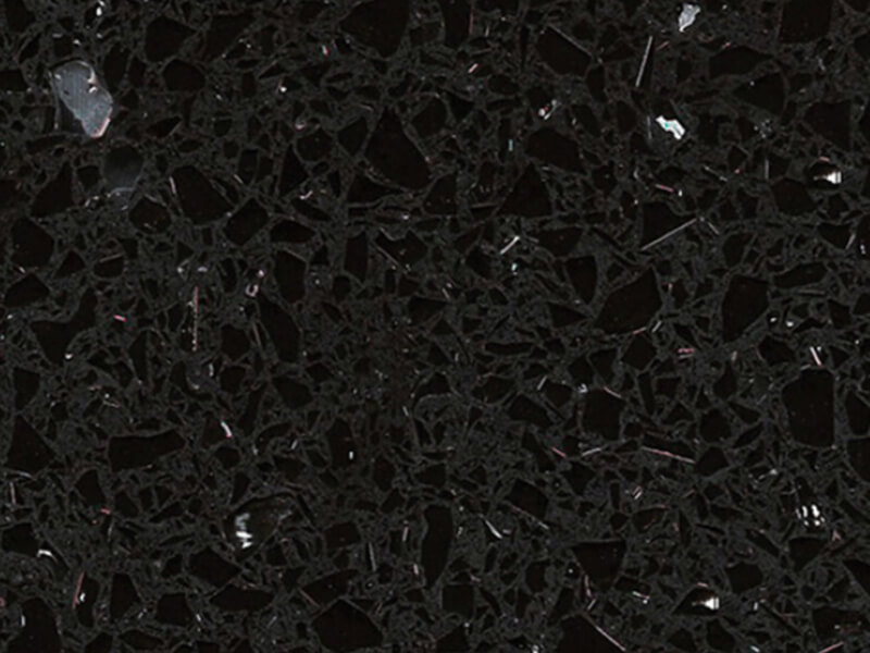 Black Mirror is an engineered quartz surface, typically composed of 90–94% crushed natural quartz crystal, bound with polymer resin and mineral pigments. With a Mohs hardness rating of 7, quartz is exceptionally hard and durable for kitchen use. The precise ratio of quartz aggregate, resin and pigment controls both the visual appearance and the surface performance. All engineered quartz slabs are manufactured to strict tolerances and tested for durability and finish quality.