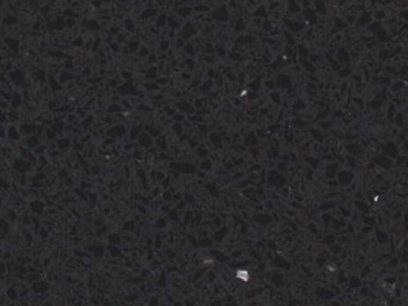 Black Shimmer is an engineered quartz surface, typically composed of 90–94% crushed natural quartz crystal, bound with polymer resin and mineral pigments. With a Mohs hardness rating of 7, quartz is exceptionally hard and durable for kitchen use. The precise ratio of quartz aggregate, resin and pigment controls both the visual appearance and the surface performance. All engineered quartz slabs are manufactured to strict tolerances and tested for durability and finish quality.