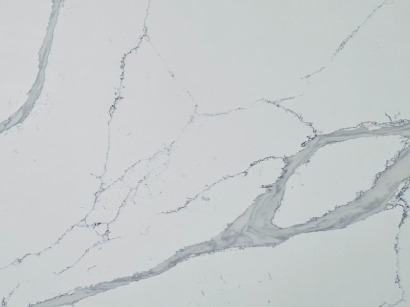 Calacatta Borghini QC is an engineered quartz surface, typically composed of 90–94% crushed natural quartz crystal, bound with polymer resin and mineral pigments. With a Mohs hardness rating of 7, quartz is exceptionally hard and durable for kitchen use. The precise ratio of quartz aggregate, resin and pigment controls both the visual appearance and the surface performance. All engineered quartz slabs are manufactured to strict tolerances and tested for durability and finish quality.