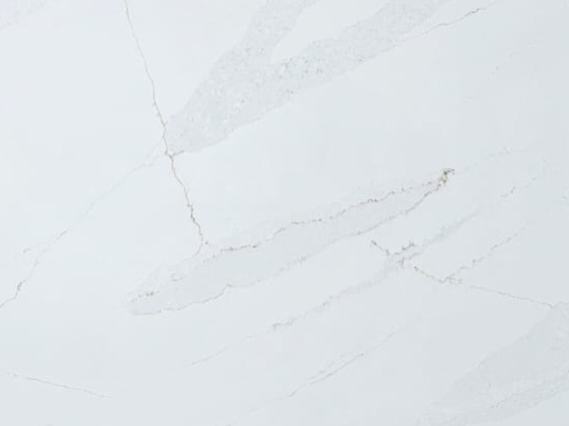 Calacatta Glow is an engineered quartz surface, typically composed of 90–94% crushed natural quartz crystal, bound with polymer resin and mineral pigments. With a Mohs hardness rating of 7, quartz is exceptionally hard and durable for kitchen use. The precise ratio of quartz aggregate, resin and pigment controls both the visual appearance and the surface performance. All engineered quartz slabs are manufactured to strict tolerances and tested for durability and finish quality.