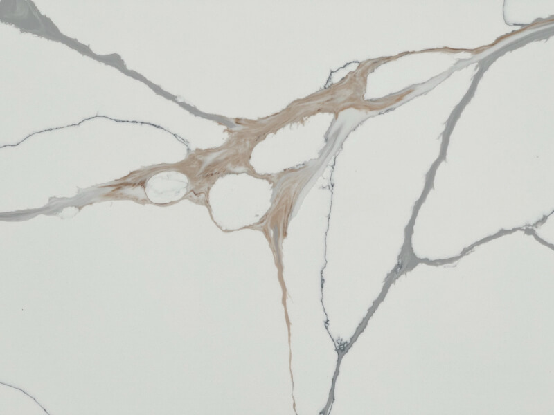 Calacatta Ragno is an engineered quartz surface, typically composed of 90–94% crushed natural quartz crystal, bound with polymer resin and mineral pigments. With a Mohs hardness rating of 7, quartz is exceptionally hard and durable for kitchen use. The precise ratio of quartz aggregate, resin and pigment controls both the visual appearance and the surface performance. All engineered quartz slabs are manufactured to strict tolerances and tested for durability and finish quality.
