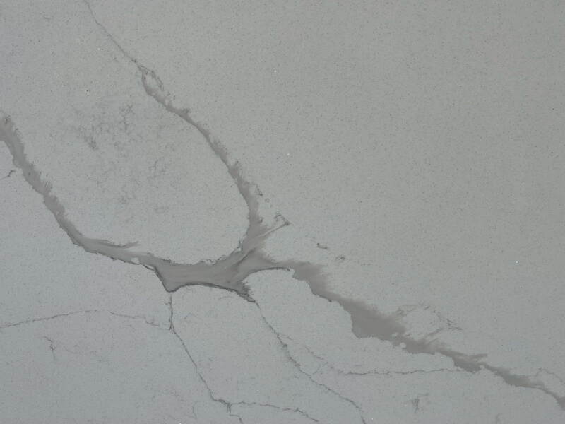 Calacutta Glacier is an engineered quartz surface, typically composed of 90–94% crushed natural quartz crystal, bound with polymer resin and mineral pigments. With a Mohs hardness rating of 7, quartz is exceptionally hard and durable for kitchen use. The precise ratio of quartz aggregate, resin and pigment controls both the visual appearance and the surface performance. All engineered quartz slabs are manufactured to strict tolerances and tested for durability and finish quality.