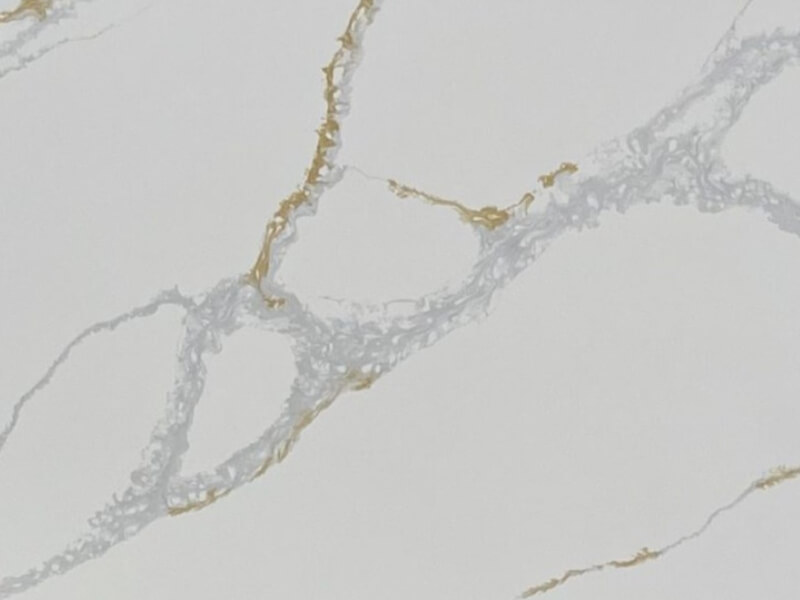 Gold Feather is an engineered quartz surface, typically composed of 90–94% crushed natural quartz crystal, bound with polymer resin and mineral pigments. With a Mohs hardness rating of 7, quartz is exceptionally hard and durable for kitchen use. The precise ratio of quartz aggregate, resin and pigment controls both the visual appearance and the surface performance. All engineered quartz slabs are manufactured to strict tolerances and tested for durability and finish quality.