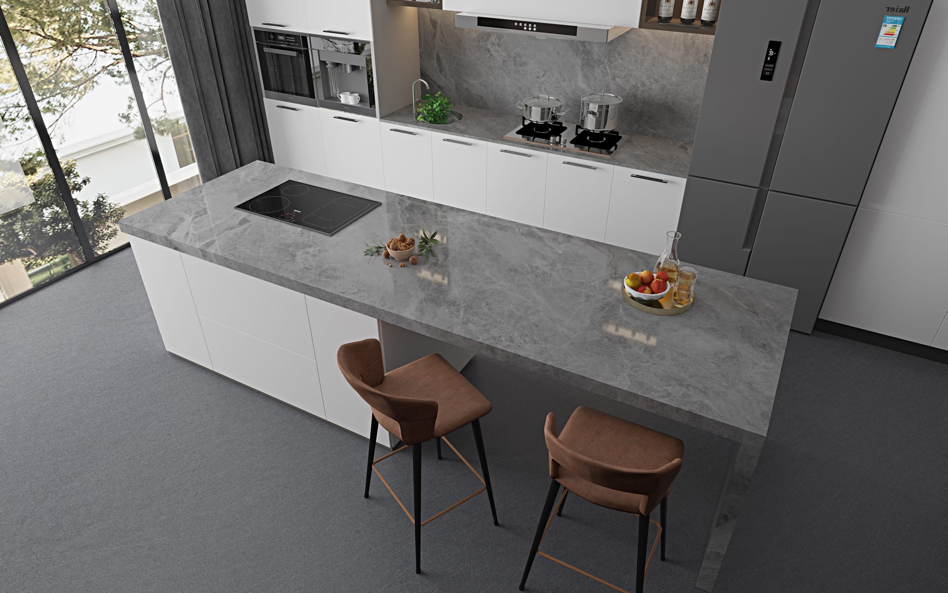 Hurricane HS is an engineered quartz surface, ideal if you want the beauty of natural stone with superior everyday practicality. It is non-porous, meaning it never needs sealing and resists staining, bacteria and everyday wear. Scratch-resistant, food-safe and extremely low maintenance, it is perfect for busy family kitchens. If you love grey tones and a polished finish, Hurricane HS is an excellent choice for worktops, islands and splashbacks.