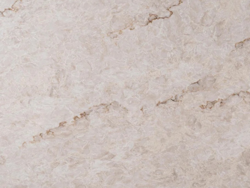 Taj Mahal Extra is an engineered quartz surface, typically composed of 90–94% crushed natural quartz crystal, bound with polymer resin and mineral pigments. With a Mohs hardness rating of 7, quartz is exceptionally hard and durable for kitchen use. The precise ratio of quartz aggregate, resin and pigment controls both the visual appearance and the surface performance. All engineered quartz slabs are manufactured to strict tolerances and tested for durability and finish quality.